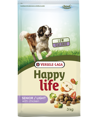 Happy life Senior / Light met Kip is een lekkere en gevarieerde energiearme voeding met kip die alle voedingselementen aanbrengt voor de oudere of obese volwassen hond.